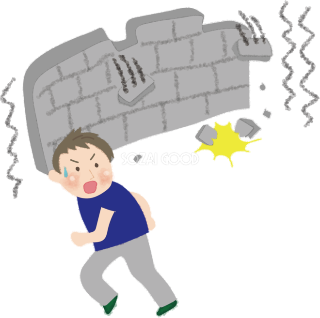 地震でブロック塀が崩れ逃げる人の無料イラスト 防災 災害49204素材Good。
