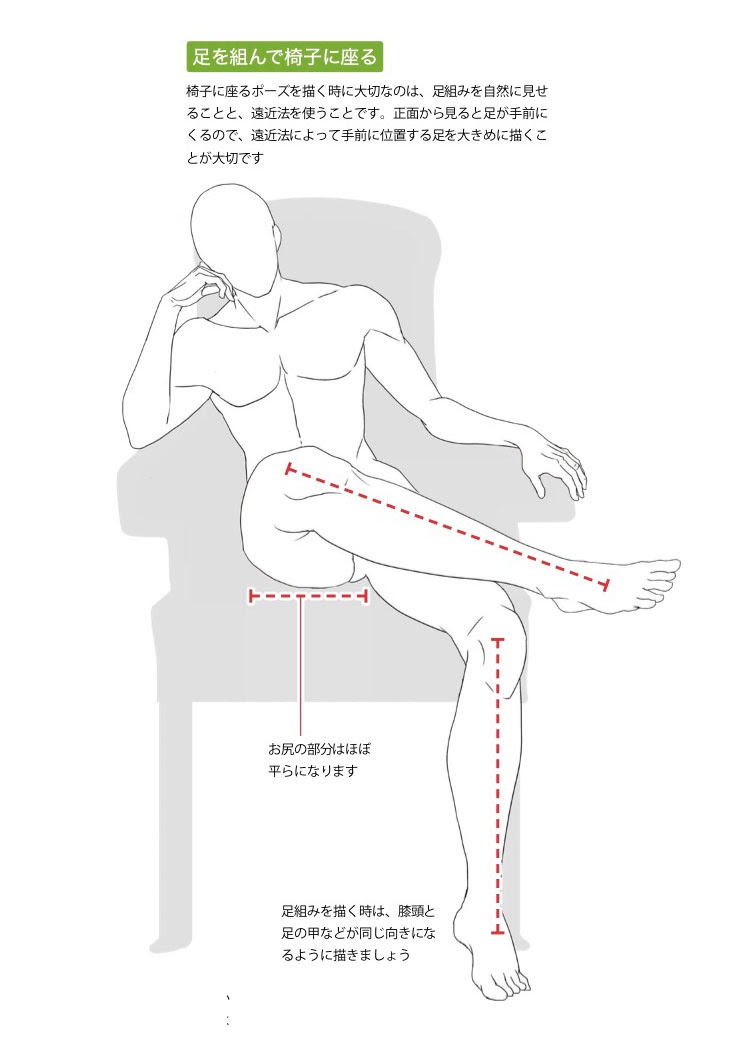 玄光社・超描けるシリーズ on X: " 創作応援ブックフェア優雅さや威厳を示すのに有効な、足を組みながら椅子に座るポーズ。遠近法を利用して、足を大きめに描くのがポイントです。『色気のある男の描き方』今なら30%オフ!https:t.co EBhxwKvQiQ https:t.co。