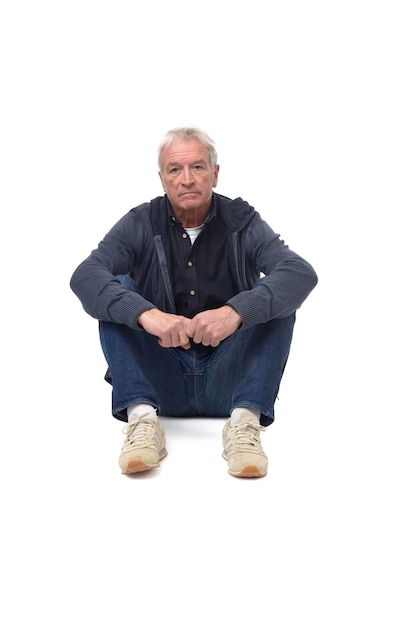 足を組んで真剣に床に座り、白い背景にカメラを見る男性の正面図Premium写真。