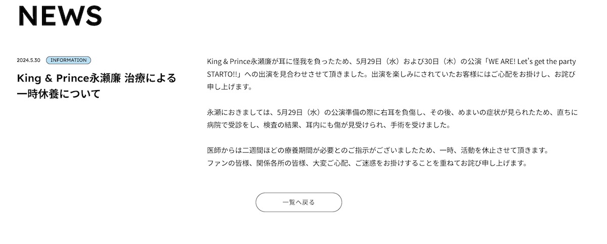 King&Prince永瀬廉 25 が耳のけがのため一時活動休止すると30日、所属するSTARTOENTERTAINMENTの公式サイトなどで発表された。手術を受け、医師から2週間ほどの療養が必要だと伝えられたという。永瀬廉kingandprince。