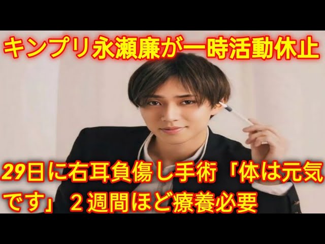 キンプリ永瀬廉が一時活動休止 29日に右耳負傷し手術「体は元気です」2週間ほど療養必要Tokyo King 👑- YouTube。
