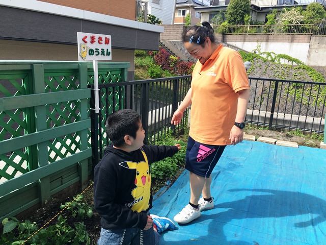 横浜市・港南台の放課後等デイサービス『くまさん横浜』農園でじゃがいもの水やりと草取りをやりました!。