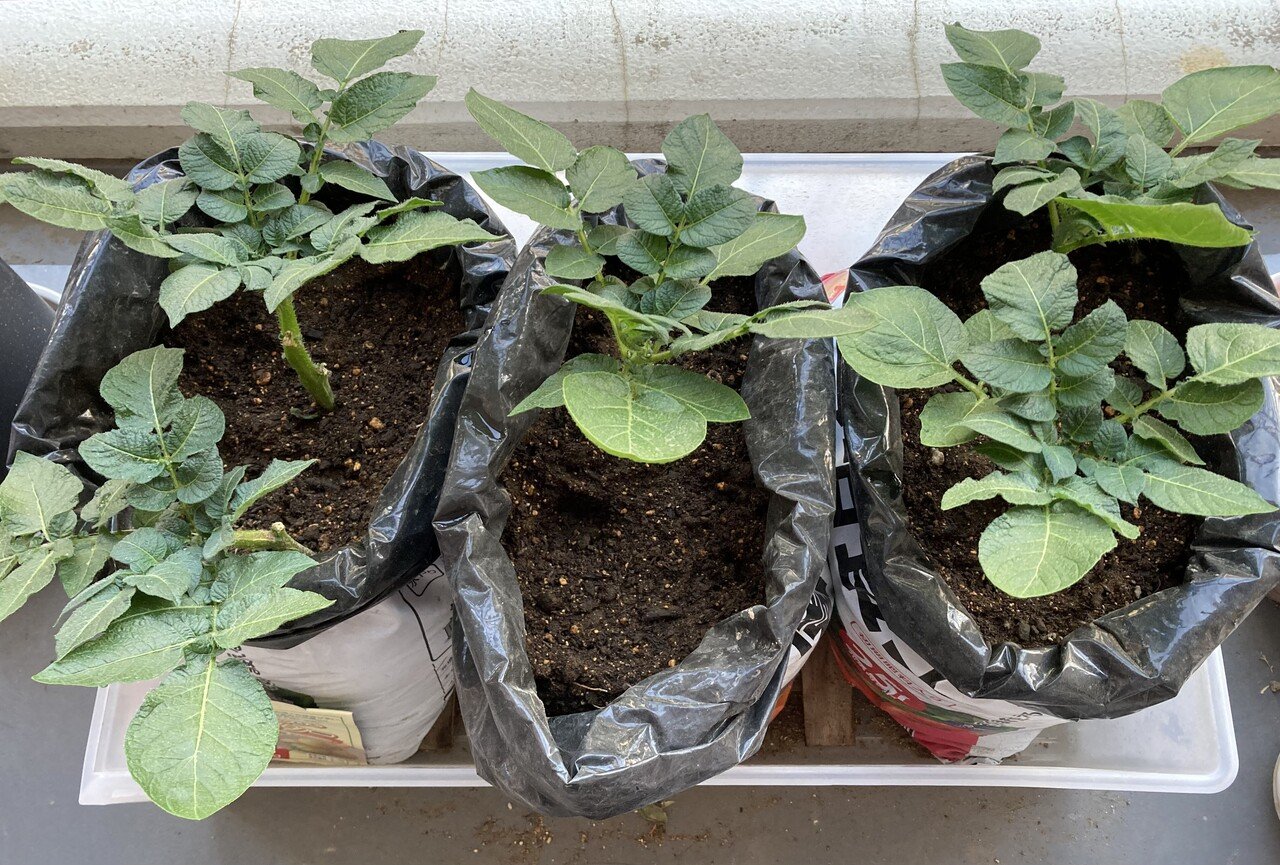 じゃがいも栽培。その後⑧元気がありません。葉っぱも所々枯れたり、折れたり。花も咲きません。水、やり 過ぎた?日当たり悪いから?どうしたものかなぁと、思いつつ、肥料と土の追加してみることに。去年は、ほったらtotoko。