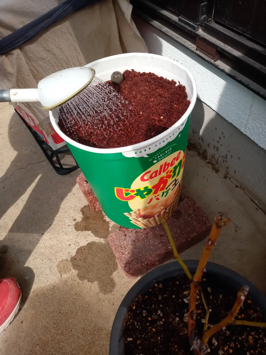 水やり「お菓子の容器型バケツでじゃがいも栽培」-そだレポみんなの趣味の園芸。