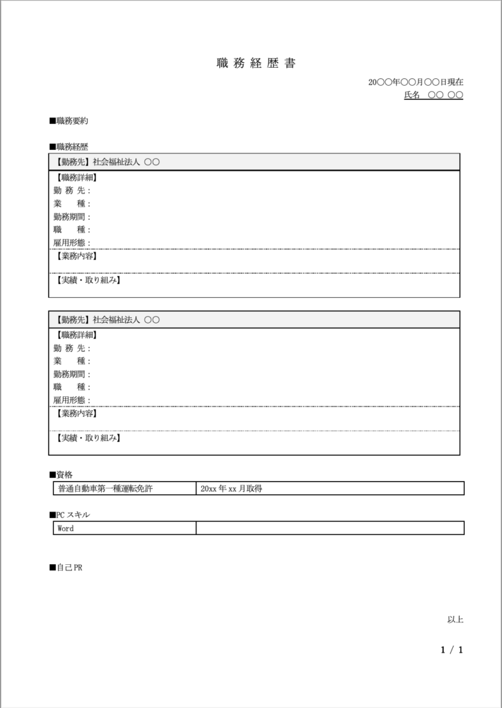 ケアマネ・介護職の職務経歴書の書き方、見本、テンプレート付きボッチブログ。