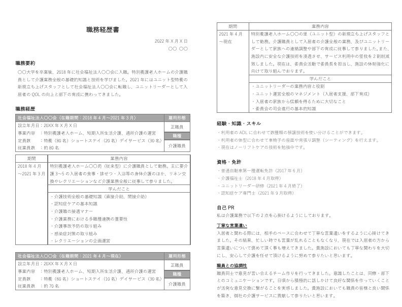転職成功者3名の実例付き 介護士の職務経歴書の書き方と見本&テンプレート無料 スマホで履歴書・職務経歴書作成テンプレートからWeb作成ミライトーチResume。
