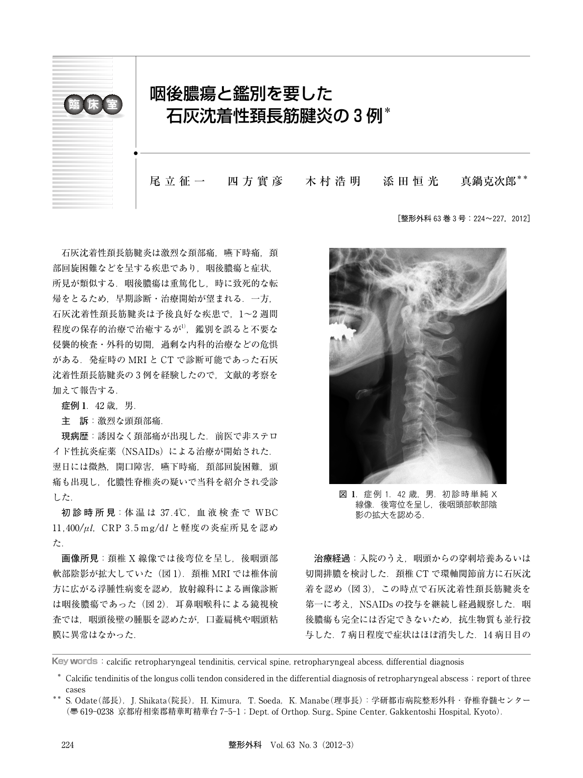 咽後膿瘍と鑑別を要した石灰沈着性頸長筋腱炎の3例臨床雑誌整形外科 63巻3号医書.jp。