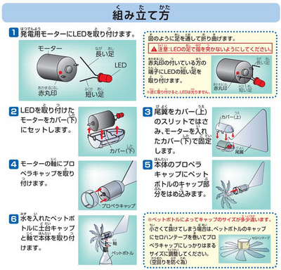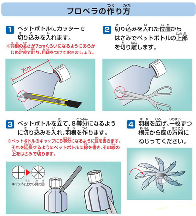 ペットボトルを使って風エネルギーを作ろうプロペラをつくる手順 工作キット。