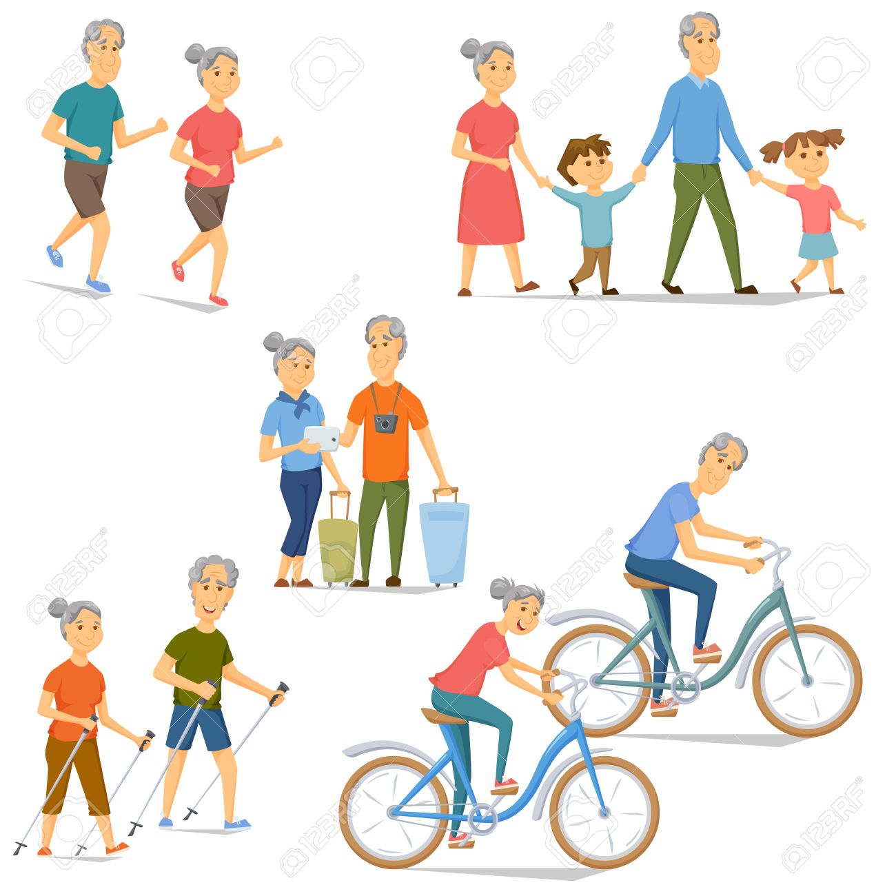 高齢者のレジャー ・ アクティビティを設定します。自転車、実行、旅行、ノルディックウォー キング、孫と Wolk の年金受給者。老人は、女性のフィットネスとスポーツのベクトルを漫画します。古い人々の健康的なライフ スタイルのイラスト素材・ベクター Image 60390814。