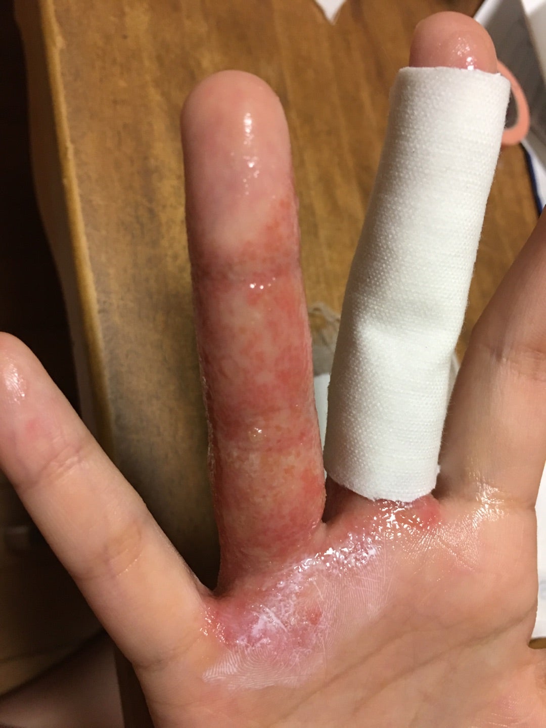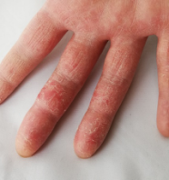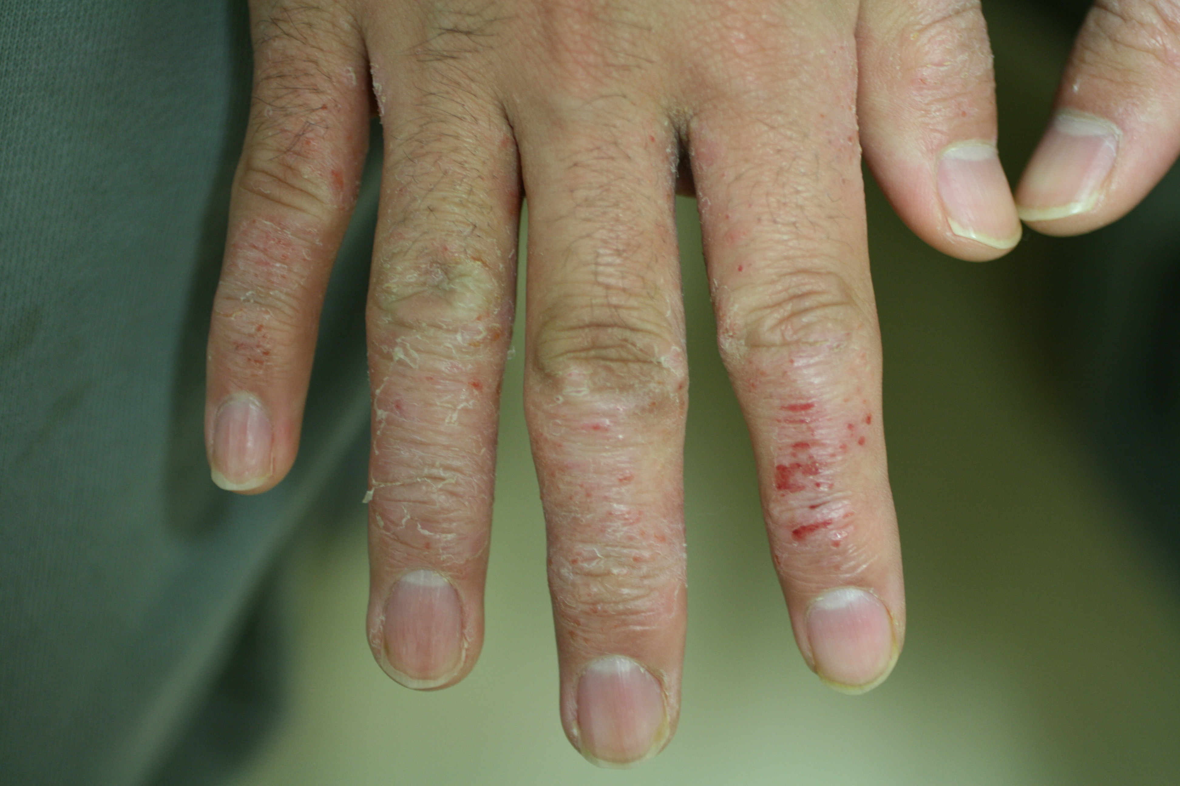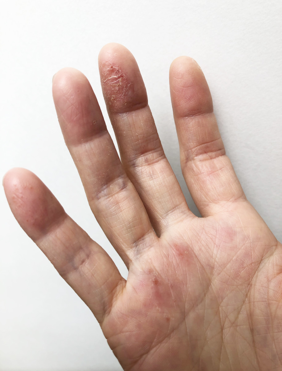 接触性皮膚炎 アルコール消毒で悪化脱ステロイド完了 指の皮がむける 接触性皮膚炎 接触性化学繊維アレルギ。