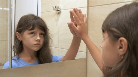 子供の鬱病。寂しそうな少女が浴室の鏡をのぞいている。」の動画素材 ロイヤリティフリー 1098255293Shutterstock。