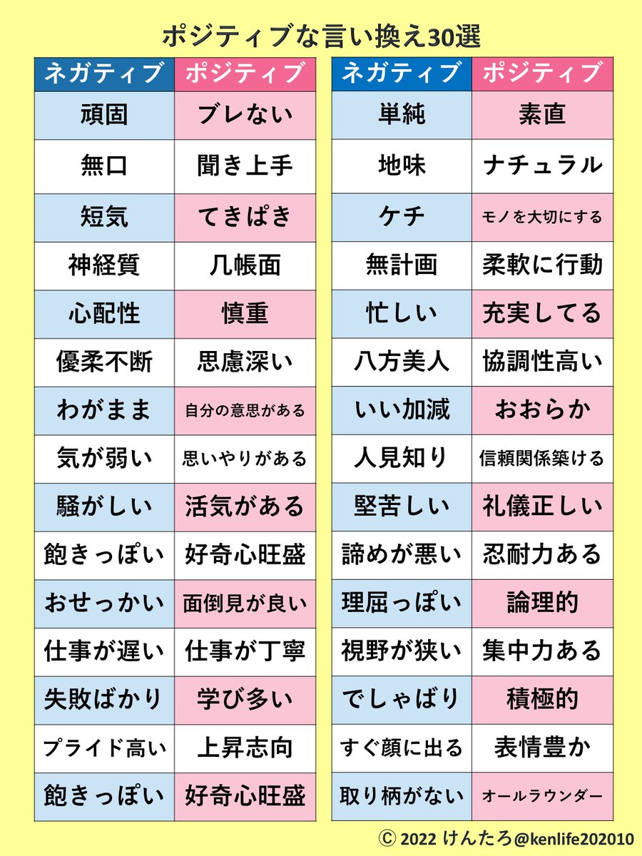 けんたろ漢検対策 on X: "言葉の使い方次第で印象は180度変わります。ネガティブ⇒ポジティブな言い換えをまとめてみました。https:t.co o0YNaHk8il"X。
