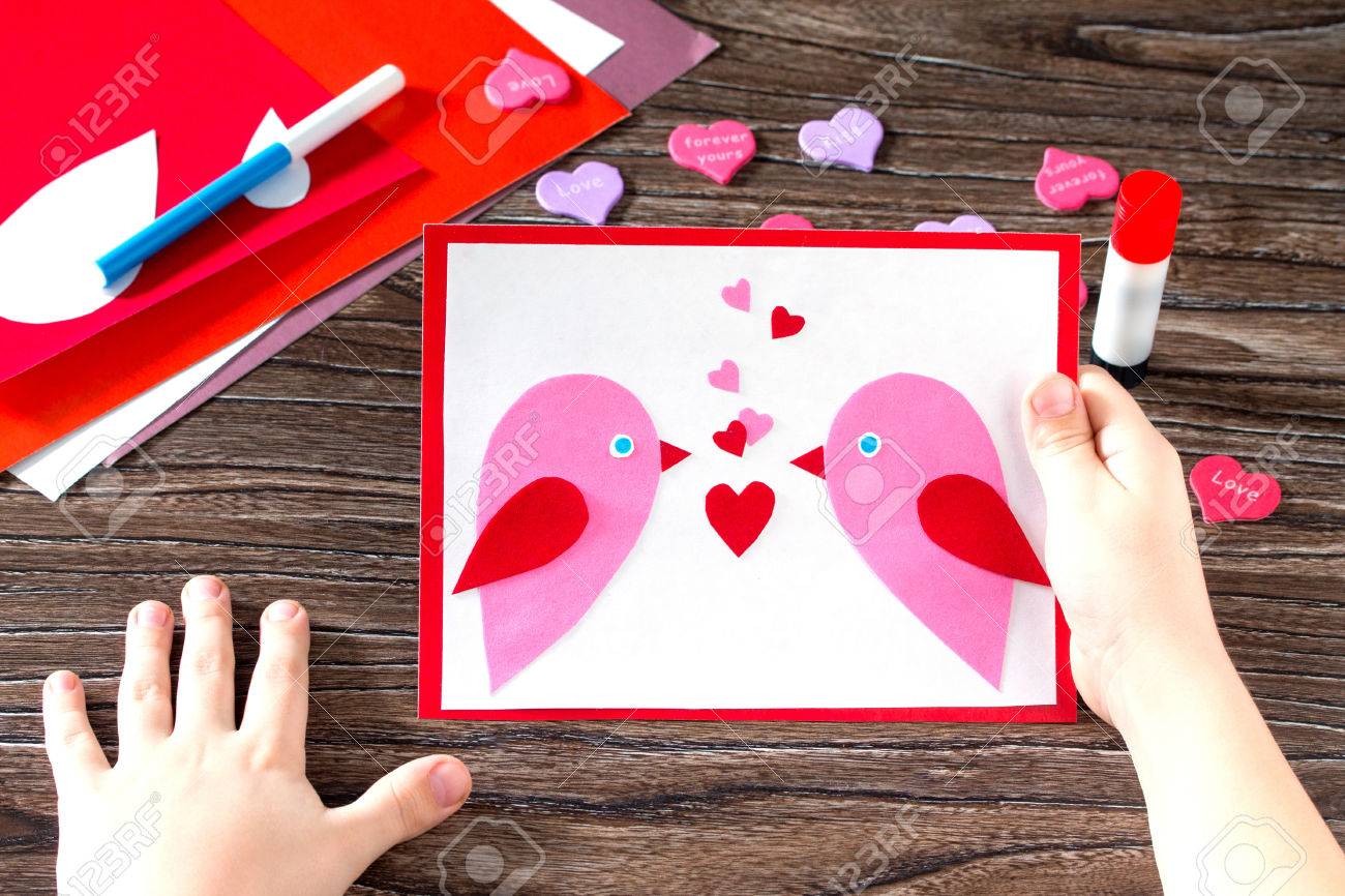 子供は、誕生日カード 2 羽の鳥と紙バレンタインの心を保持します。子どものアート プロジェクト、子供のための工芸品。手作りです。の写真素材・画像素材Image 68172508。