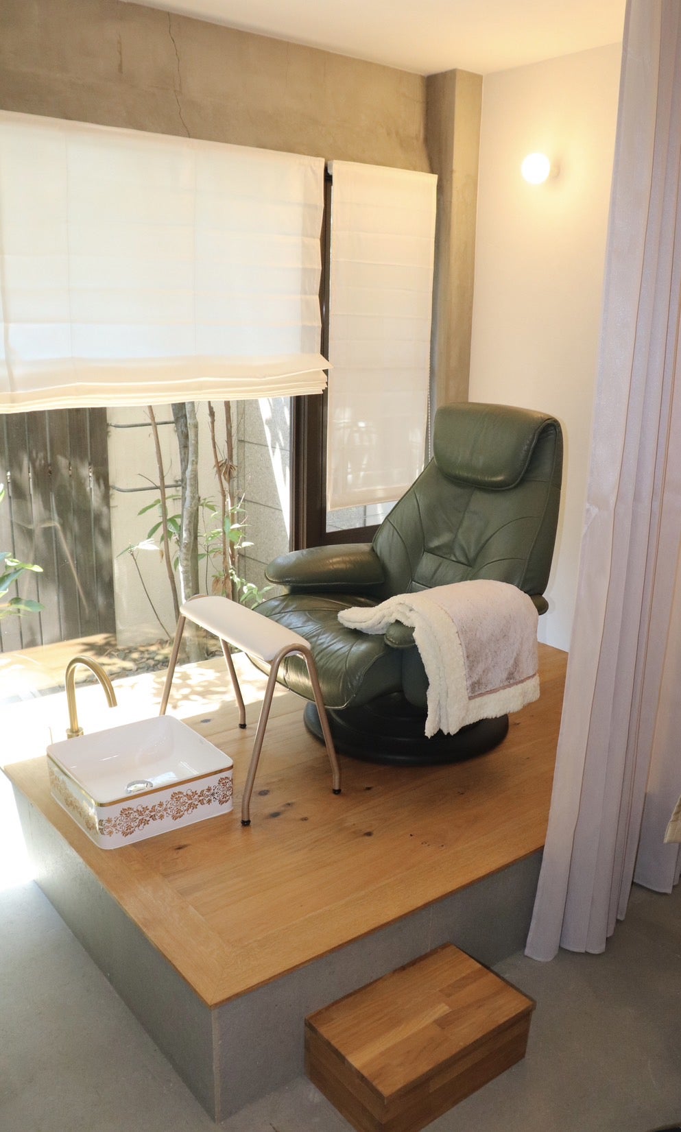 フットネイル施術はまず始めにフットバスから。, 除菌、洗浄とスクラブ&マッサージを💙, バスソルトのいい香りで,お客様も気持ちよく、リラックスしていただけます😊, フットスペースは, 床を30センチ程上げて, その上にリクライニングチェアを, 置いています。,手前にシンク、, 右側床から直接お湯が出ます。, 参考にしてくださいね!,フットネイルネイルサロンネイルサロン内装。