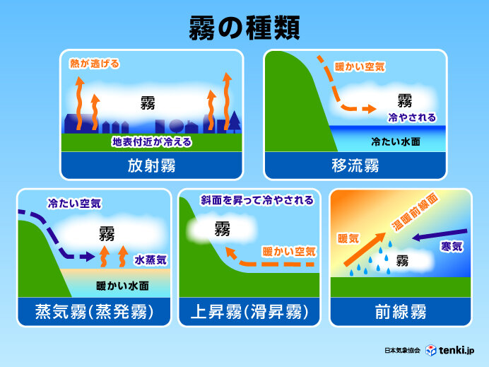 霧の正体とは?もや・霞との違いや発生条件、種類について解説 季節・暮らしの話題 2025年05月06日- 日本気象協会 tenki.jp。