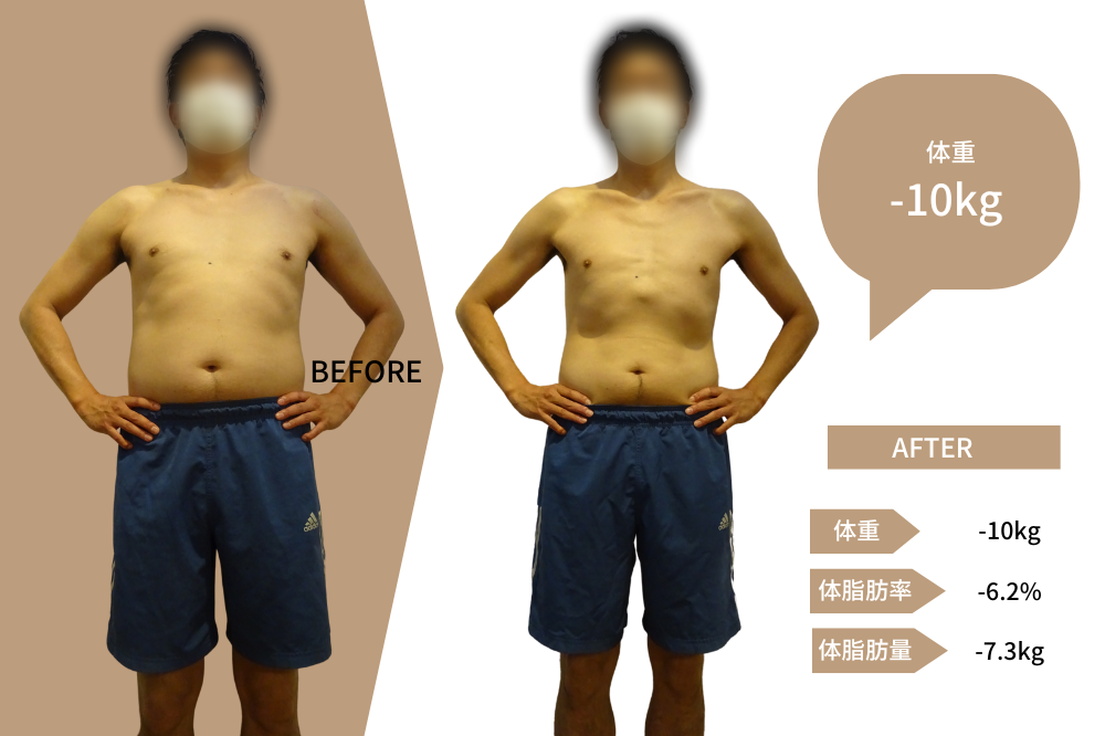 ダイエット 男性40代 約2ヶ月半で-10kg!!実績No.1 熊本市中央区でダイエットならパーソナルトレーニングジムLEAF 女性も多数。