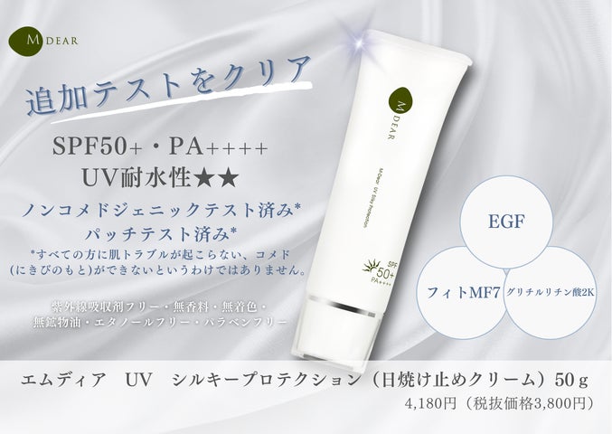 追加試験クリア!エイジングケア*コスメ『UV シルキープロテクション』医療機関専売スキンケア M-Dear エムディア株式会社メイフラワーのプレスリリース。