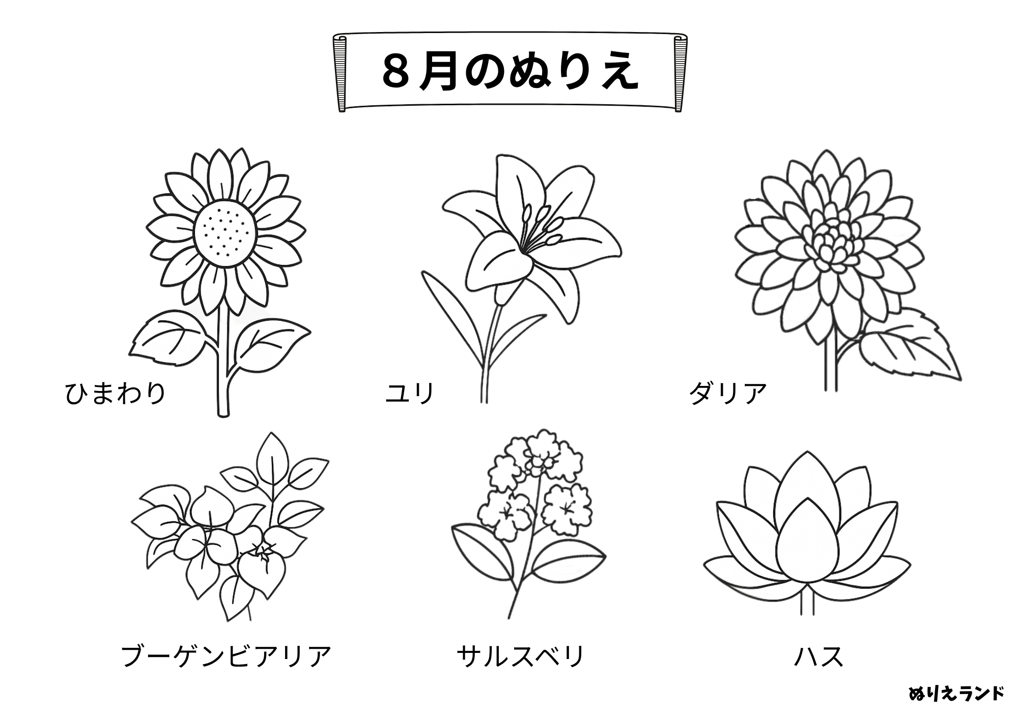 8月の花 塗り絵高齢者も楽しめる!ひまわり・ユリ・蓮 無料ダウンロード。
