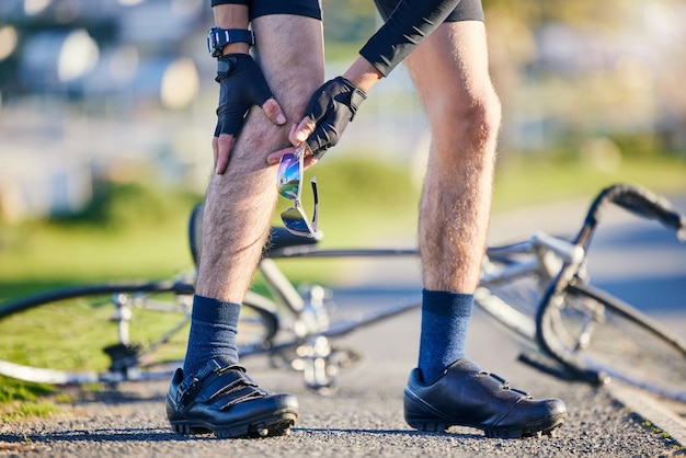 男性のサイクリストと膝の怪我の事故や脚、サイクリング運動フィットネスや道路での屋外トレーニング後の痛みの打撲炎症や自転車転倒の男性やバイカーのクローズアップPremium写真。