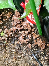 今年はよく出てくるなあ キララタケがプランターからキラキラタケじゃないよ😓キララ。 広葉樹の朽木や地面に埋もれたおがくずなどに群生するので、腐葉土にくっ付いてきたのでしょうね。同じ培養土を使ったプランターから、全部出てきました。雨が降るたびに元気に頭を。