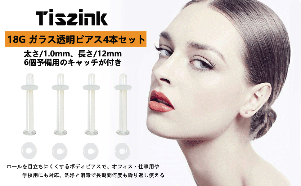 AmazonTiszink ガラス ピアス 18g 透明ピアス ガラスピアス ガラスリテーナー 4本セット 6個予備用のキャッチ付き 透明 ピアスファーストピアス シークレットピアス 軟骨ピアス ボディピアス ヘリックス トラガス 樹脂製のOリング金属アレルギー対応 4本ガラス透明。