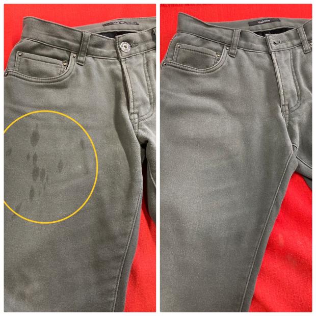 ジーンズ・デニムの油染みは生活洗剤で簡単に落とす。