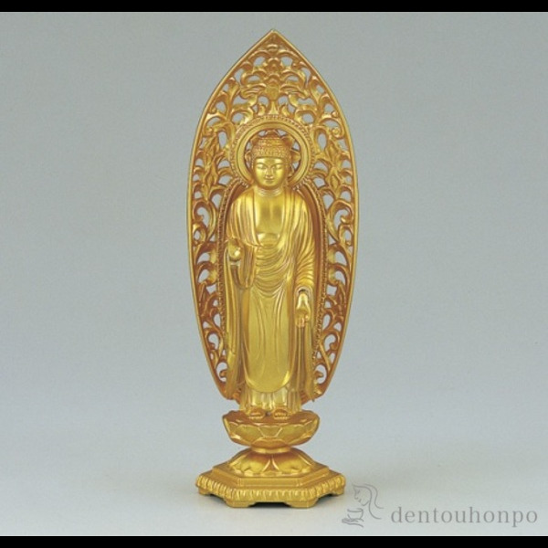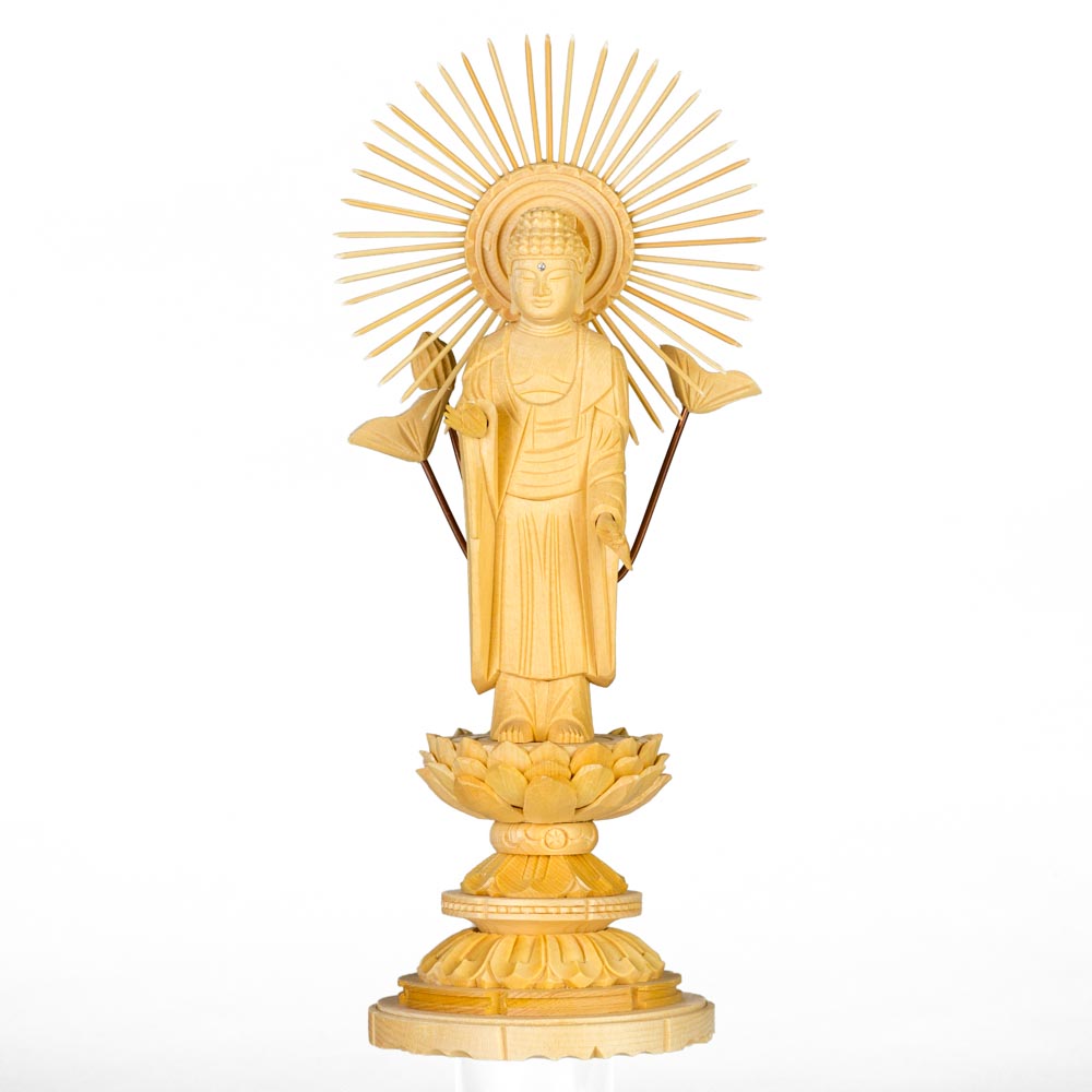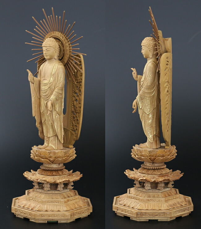 仏像 仏像 桧木 阿弥陀如来 立像 八角台座 西型唐草光背 3.0寸 浄土真宗本願寺派 高さ202mm 横幅77mm 奥行き67mm ご本尊様 守本尊本尊 仏様 仏壇 フィギュア 仏像 西本願寺 浄土真宗本願寺派阿弥陀如来 楠製 六角台座 金泥付 眼入仏壇大はし 奈良市・天理市・橿原市。