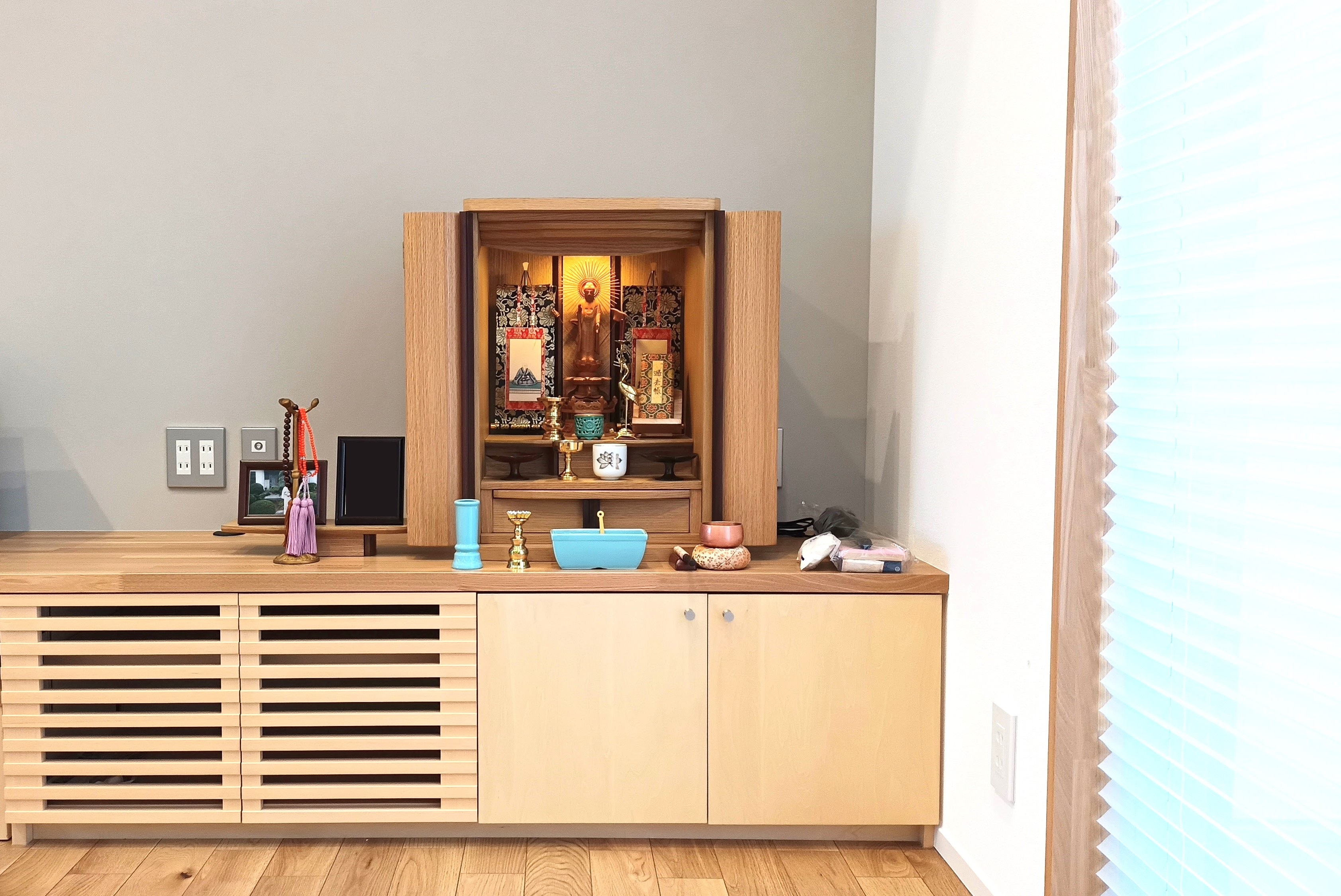 山形市S様 大きいお仏壇の阿弥陀様と掛け軸を残し、それに合うコンパクトなお仏壇に買い替えました。リビングに置いた事により、いつでも見守ってくれている感じです。山形市の仏壇・仏具・墓石長門屋。
