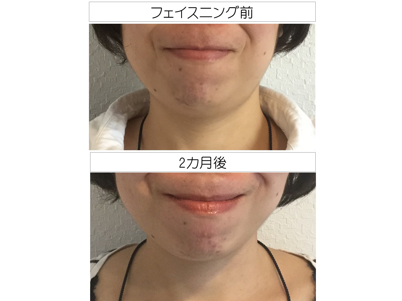 生徒さんビフォーアフター2ヶ月の変化。 最初はなかなか思うように動かないお顔を試行錯誤。動画で練習の様子を何度も送ってくださり、課題だった顎の力もだんだんと抜けてきました。 お悩みの中で笑った時にできる口の横に出来るドレープみたいな線。これが気になる。