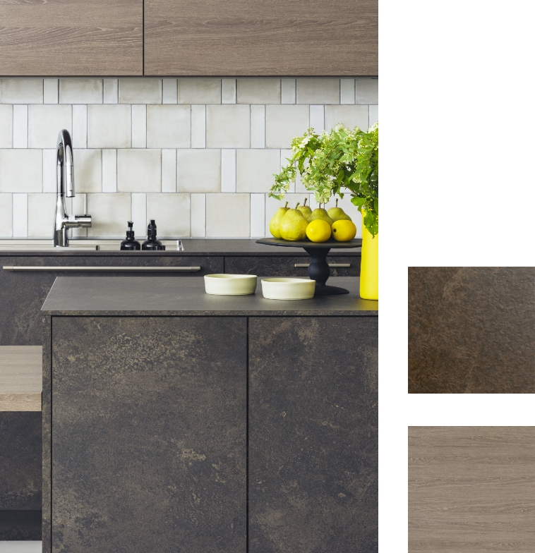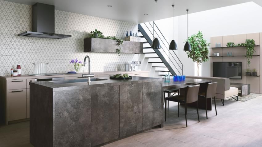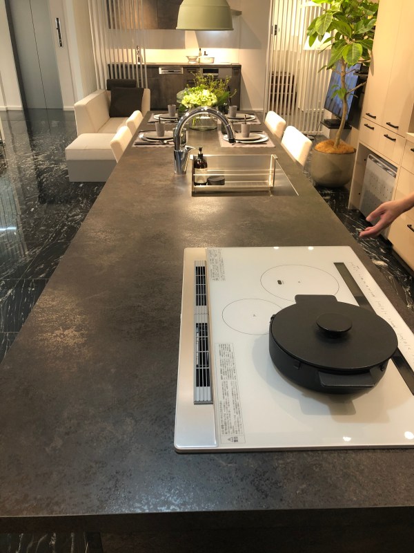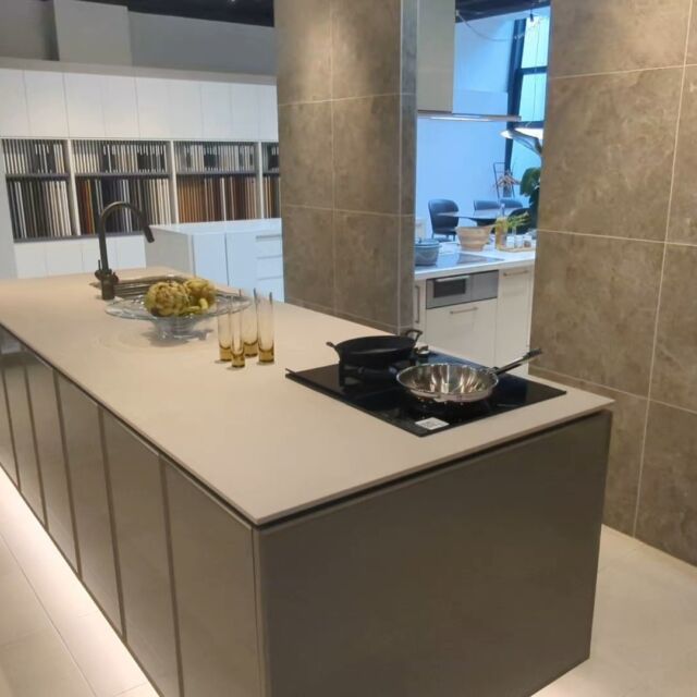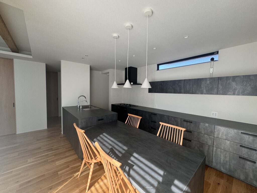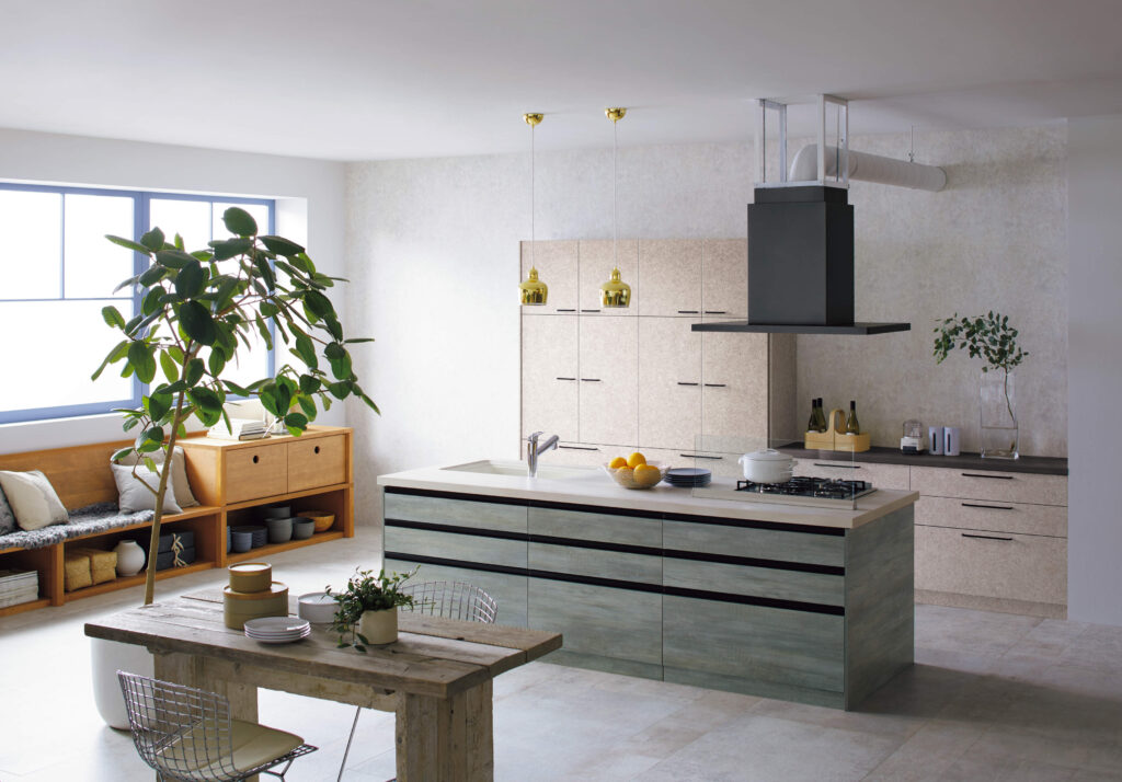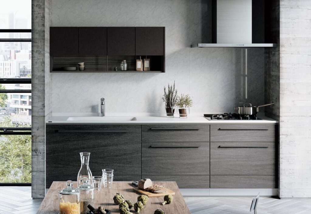 ショールーム展示のご紹介滲んだ墨色のような、特徴的なカラー「ベトングレー」まるでオブジェのような雰囲気を醸し出し、主張しすぎること無く空間に馴染んでいます。 ベトングレーのキッチンと荒々しい木目が特徴のアンティコパインのダイニングが一体成形され。