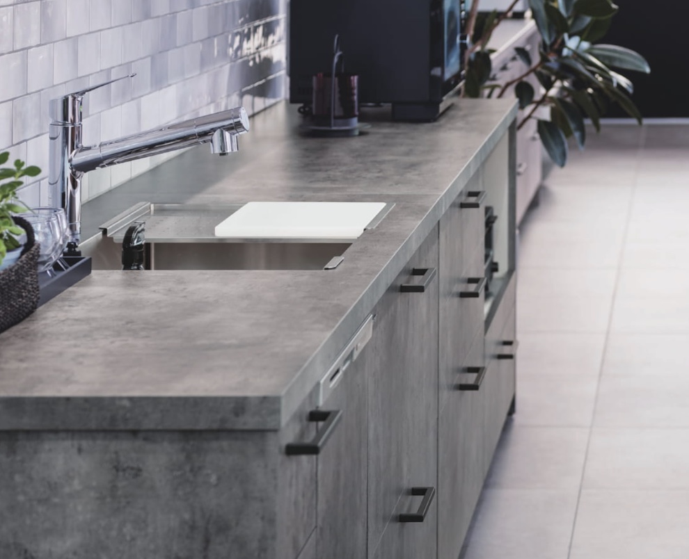 造作キッチン シンク:ステンレス 側板:エバルト ベトングレーTECTURE テクチャー。