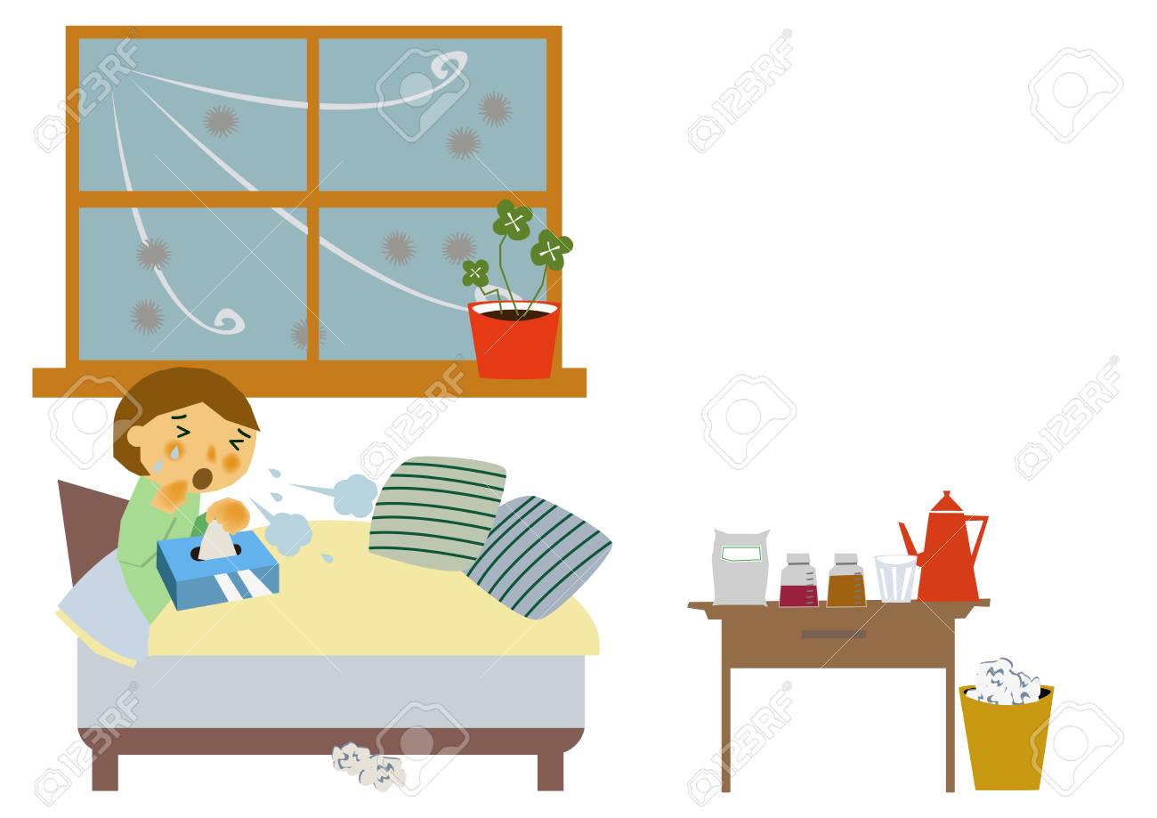 風邪で寝込む子供のかわいいイラスト画像素材 フリー、無料。