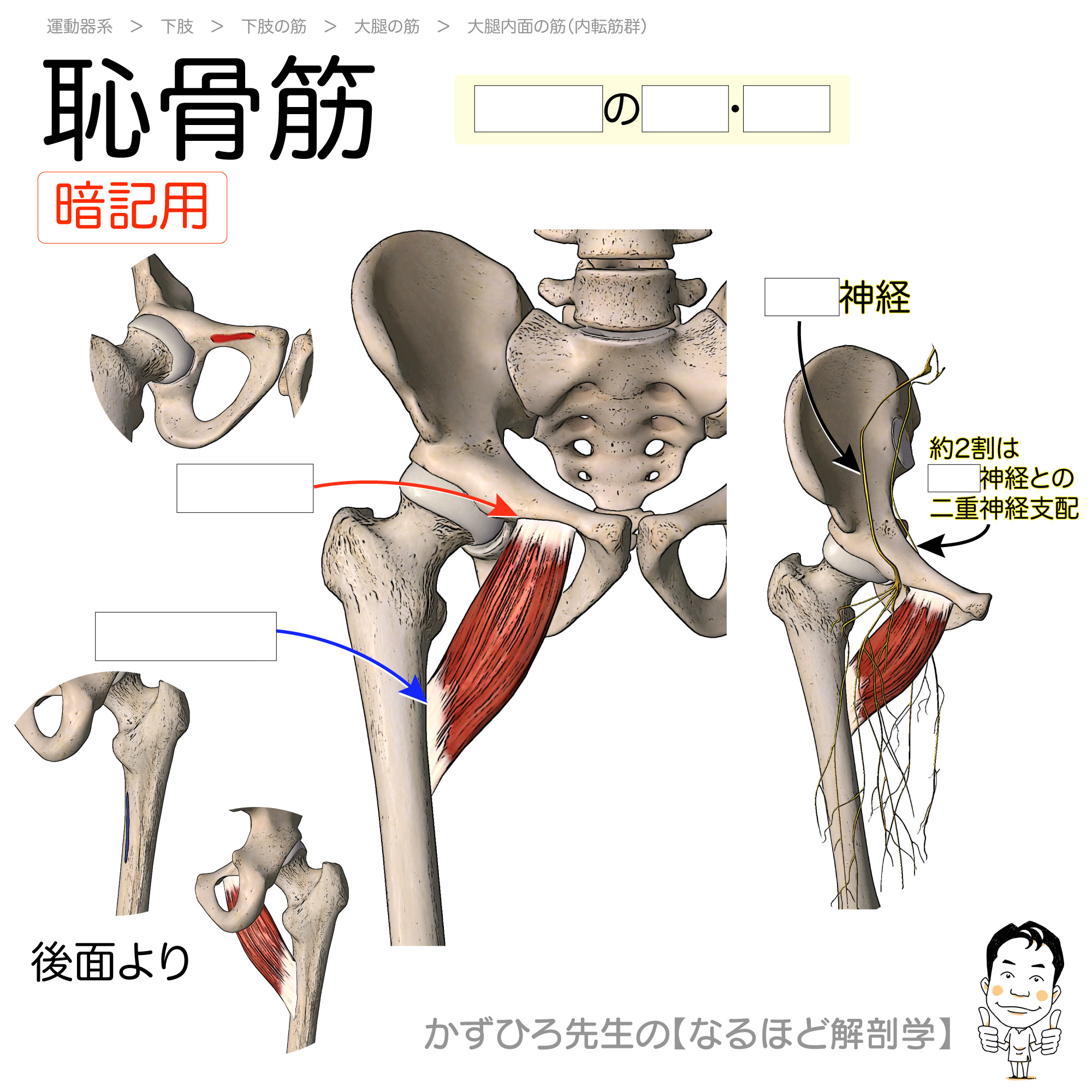 恥骨筋の起始・停止・支配神経 pectineus 暗記用画像付き徹底的解剖学 かずひろ先生 解剖学。