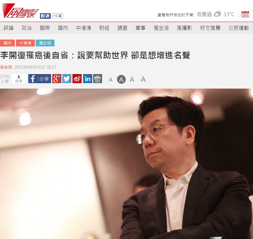 李開復罹癌後自省:說要幫助世界卻是想增進名聲 葉瑜娟 風生活- 風傳媒。