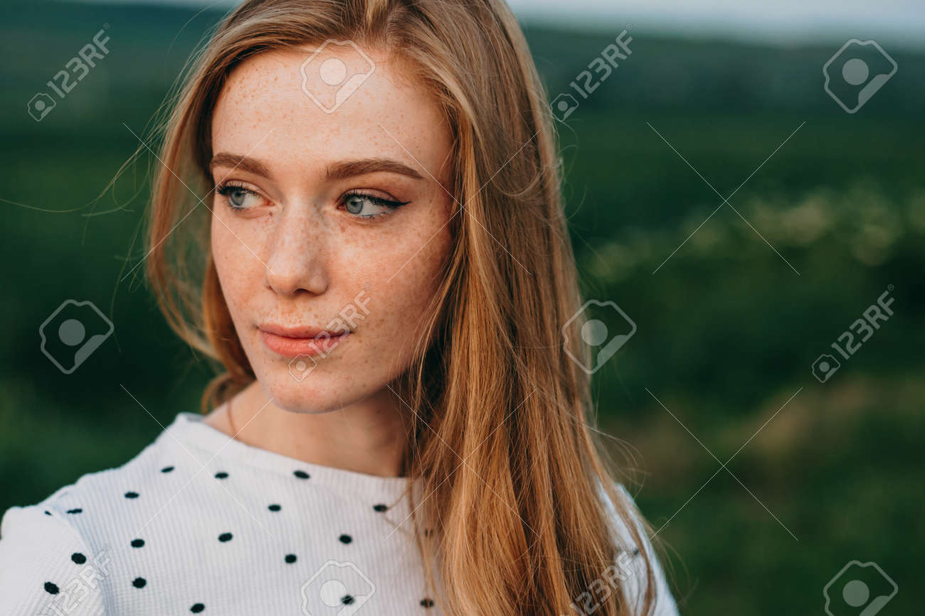 そばかすのある白人の生姜女性の自然な接写。かわいい女性モデル。自然の美しさ。アートポートレート。ファッションモデル。美人顔。の写真素材・画像素材Image 187254903。