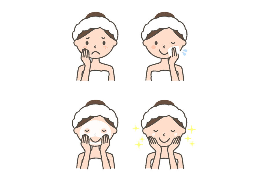 スキンケアする女性のイラスト4種「肌荒れ・パッティング・パック・美肌」可愛い無料イラスト・人物素材 - フリーラ。