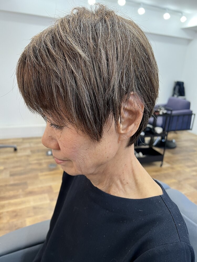 白髪が多い方必見!これからは明るめのアッシュグレーでお洒落れカラーにしませんか? さなえさん の髪。
