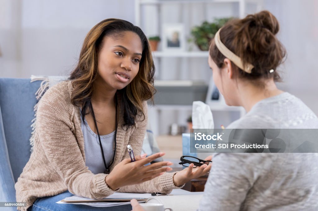 若い女性カウンセラーがクライアントと協議します - 精神保健専門家のストックフォトや画像を多数ご用意 - 精神保健専門家, 話し合い, 顧客 -iStock。