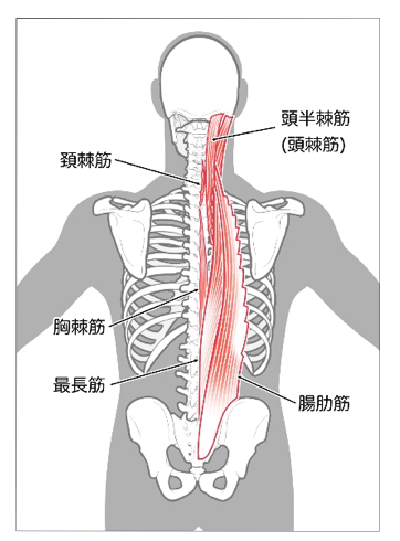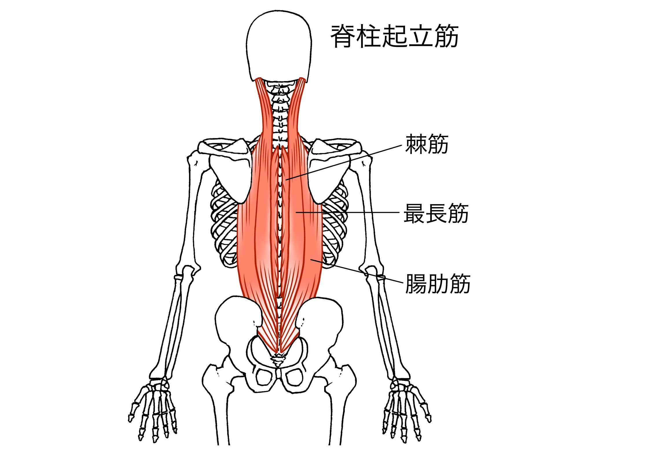 脊柱起立筋 せきちゅうきりつきん解剖学では 背骨の事を脊柱と言い 脊柱に沿って付着する ・腸肋筋 ちょうろくきん・最長筋 さいちょうきん・棘筋 きょくきんの3つの筋肉を総称して 脊柱起立筋と呼ぶ 脊柱起立筋は 脊柱の左右にあり 両側が同時に働くと 脊柱を。