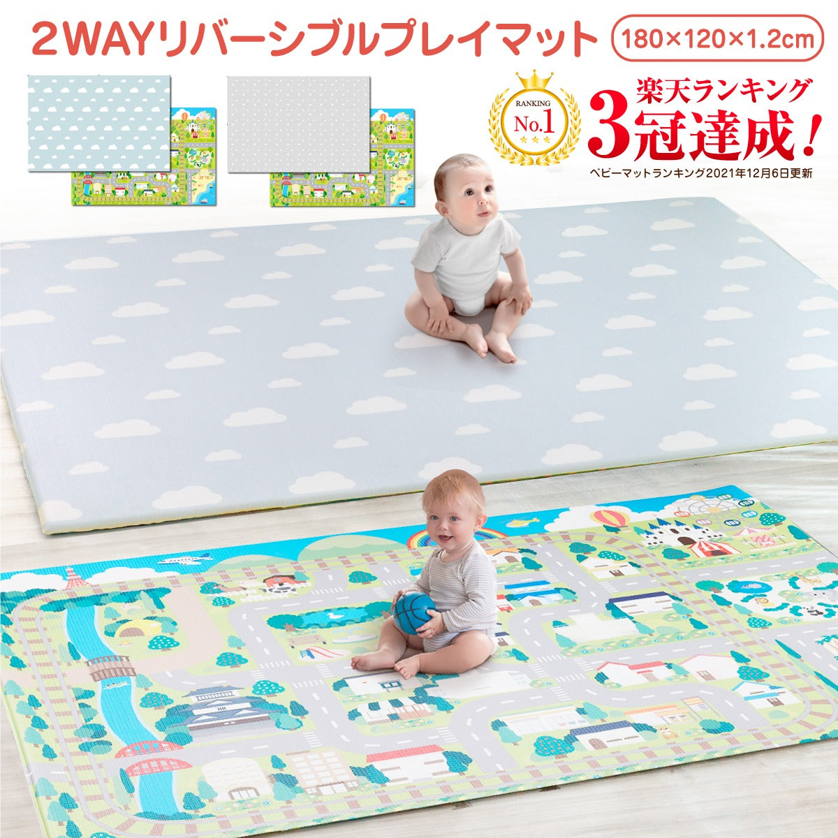 楽天3冠達成! もっちりベビーマット プレイマット 赤ちゃん 2WAY リバーシブル ベビー 道路 防水 厚手 お昼寝 180×120 防音衝撃吸収 防水 日本メーカー製 安全検査済 BabyGoo。