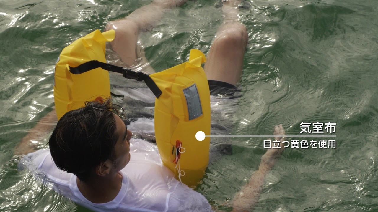 ウエストベルトタイプ膨脹式ライフジャケットの膨脹シーン。